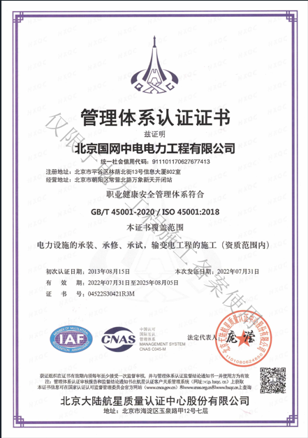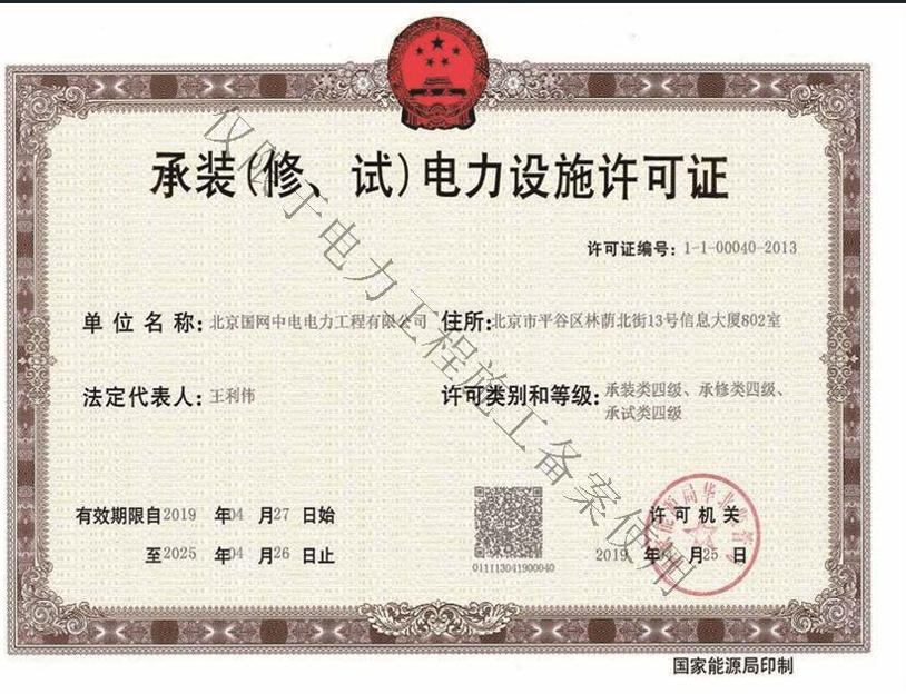 北京國網中電電力工程有限公司,已取得國家電監會頒發的《承裝(修、試)電力設施許可證》、為電力施工承裝四級、承修四級、承試四級企業。北京市住房和城鄉建設委員會頒發的房屋建筑施工總承包二級、機電設備安裝工程專業承包二級、輸變電專業承包二級、城市及道路照明工程專業承包二級、市政公用工程總承包二級資質、勞務不分等級,已通過ISO9001:2015 GB/T50430-2017質量管理體系、GB/T24001-2016/ISO 14001:2015環境管理體系、